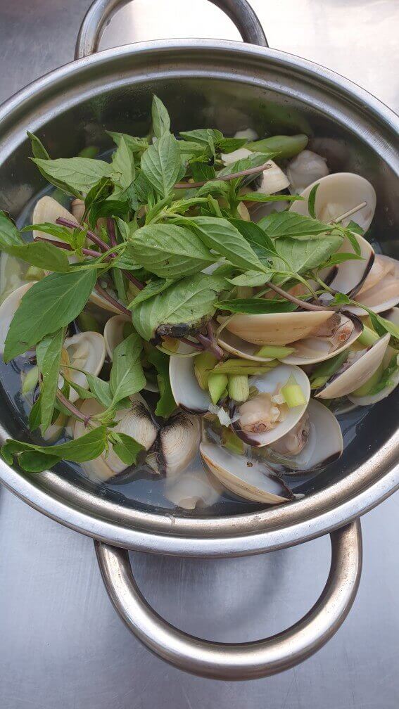 잘게 썬 레몬그라스와 함께 조개가 듬뿍 들어있는데