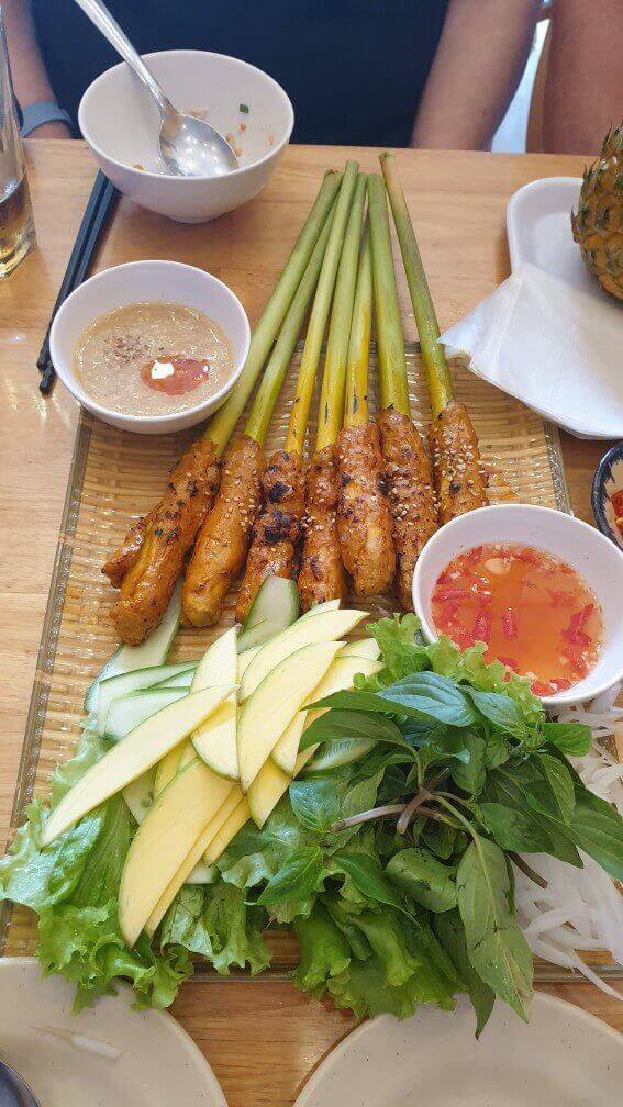 레몬그라스에 말려있는 고기를 빼내 야채와 함께 소스에 찍어먹으면 됩니다.
